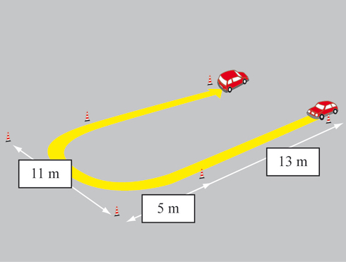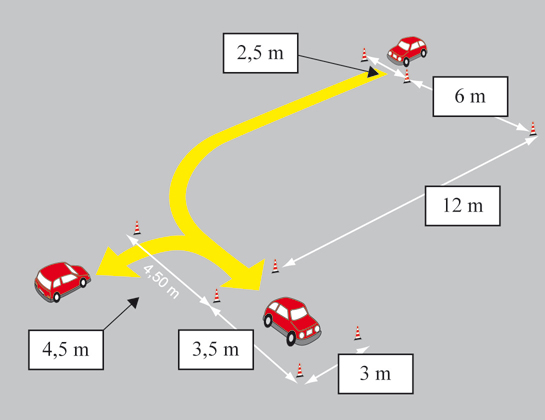Il candidato, partito all'altezza del primo cono, dopo aver percorso in linea retta circa 10 metri, svolta a sinistra ed arresta il veicolo all'interno dell'area di sosta delimitata da quattro coni; inserisce successivamente la retro marcia e svolta a destra lasciando alla propria sinistra l'ultimo cono delimitatore.