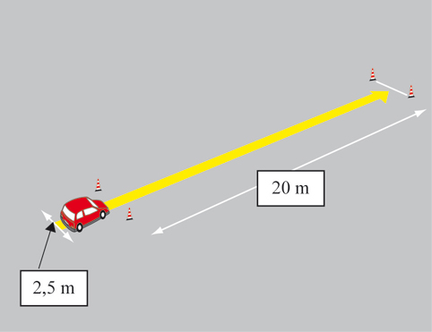 Il candidato, partendo dall'inizio della base di 25 m, deve passare ed arrestare il veicolo in modo che la ruota anteriore superi il primo allineamento, ma non il secondo.