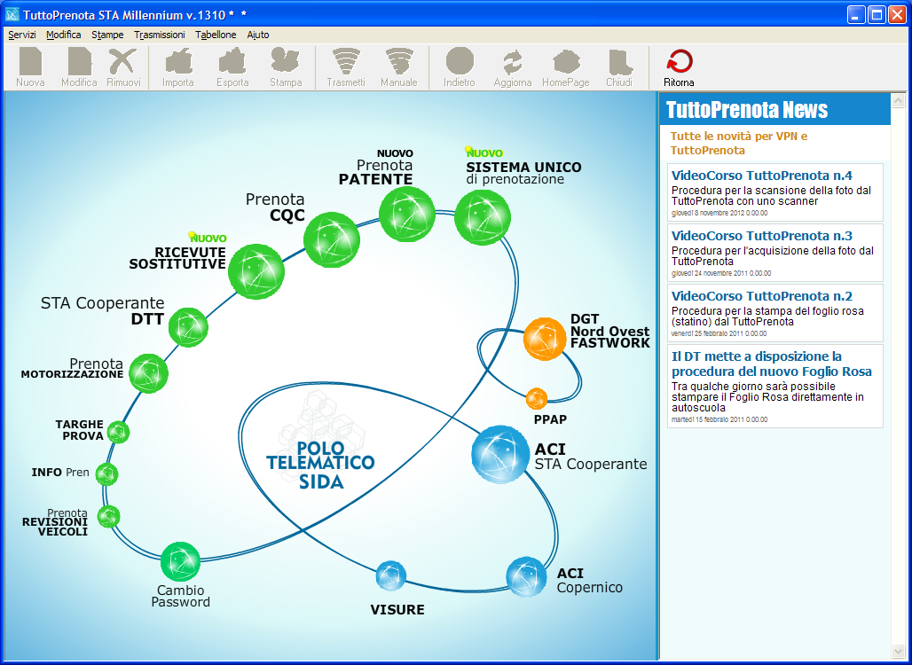 Per consentire a tutti i clienti di essere sempre al corrente di tutte le novità tecniche e operative inerenti i software SIDA, a partire da questo aggiornamento verranno visualizzate in automatico, all'apertura di SIDA Tuttoprenota, tutte le notizie relative ad esso. In particolare, si potranno agevolmente consultare videocorsi, istruzioni operative, ma anche novità normative da conoscere per operare correttamente con SIDA Tuttoprenota. Cliccando sulla news da approfondire, verrà effettuato un collegamento al sito www.patente.it per la lettura dell'intera notizia.