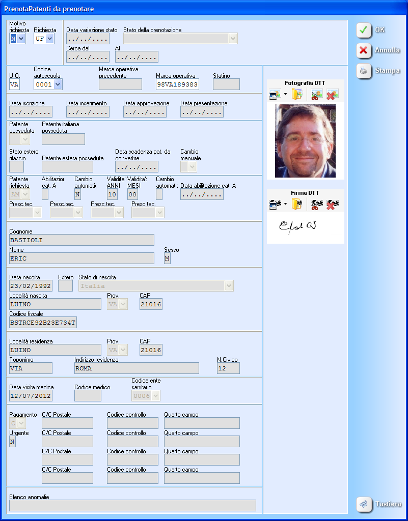 • UP: permette di aggiornare sia la parte anagrafica della pratica sia foto e firma;