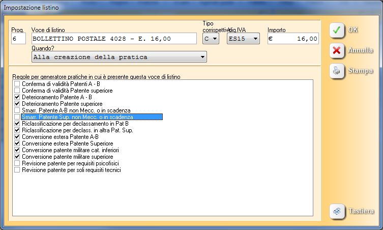 Per i clienti che utilizzano la contabilità di SIDA, cliccare anche sulla voce Imposta – listino completo. Aprire con doppio click la voce di listino “bollettino postale 4028 – E. 14,62” e aggiornare manualmente, sia la voce di listino sia la casella Importo, come in figura.