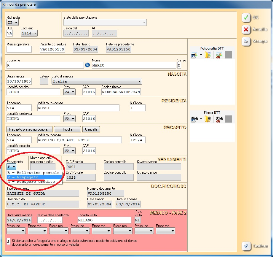 In Pratiche selezionando una pratica di Conferma validità, in basso a sinistra troveremo la sezione dedicata al Pagamento. Selezioniamo da Pagamento la voce "P Prepagato" (credito su carrello prepagato): verranno sfruttate e scalate in automatico le pratiche pagate sul Portale dell'automobilista con il sistema “Pagamento pratiche on line”. Sul portale dell'automobilista è possibile pagare, grazie al servizio “Pagamento pratiche on line” una serie di pratiche di rinnovo patente (bollettino 9001 + bollettino 4028 + commissioni bollettini) a scelta, senza recarsi in posta.