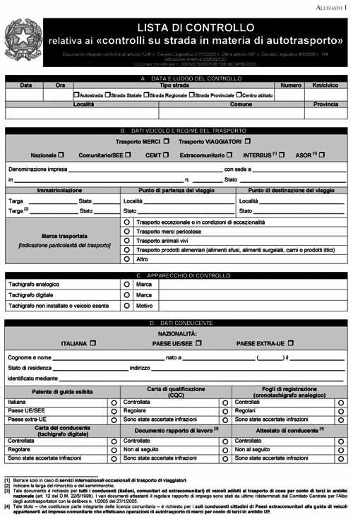Decreto Interdirigenziale - 14/09/2009 - Lista di controllo per controlli su strada