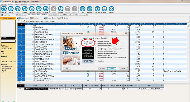 Da oggi è possibile gestire completamente la preparazione del candidato anche su SIDA Quiz App. L'autoscuola può decidere (come sul Quiz Casa) su quali e quanti argomenti il candidato può e deve esercitarsi e se può o meno fare le schede fac-simili o le schede difficili: ciò permette all'insegnante di decidere se lasciare libero il candidato di esercitarsi come meglio crede oppure se seguirlo passo passo nella sua preparazione.