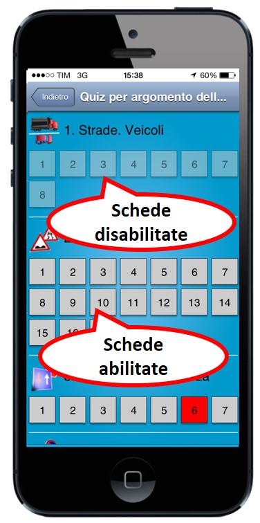 - le schede assegnate compariranno in SIDA Quiz App, quelle bloccate appariranno come disabilitate così come da schermata di esempio qui sotto: