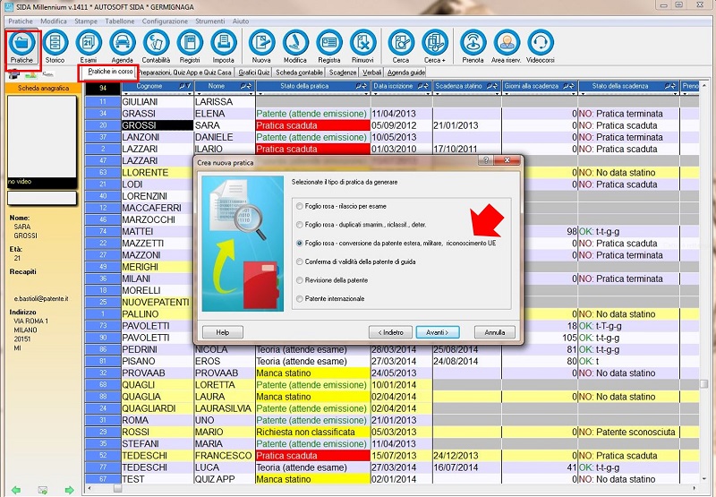 - da Pratiche>Nuova cercare il nome dell'interessato, cliccare su Avanti e successivamente scegliere Crea nuova pratica da zero. Cliccando ancora su Avanti si arriverà alla schermata qui sotto, dalla quale selezioneremo la voce Foglio rosa - conversione da patente estera, militare, riconoscimento UE: