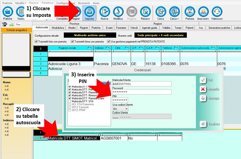 allora, per impostare il PIN, è necessario andare su SIDA Gestione, cliccare su Imposta, poi sulla tabella autoscuole e, sulla credenziale corrispondente, impostare il PIN:
