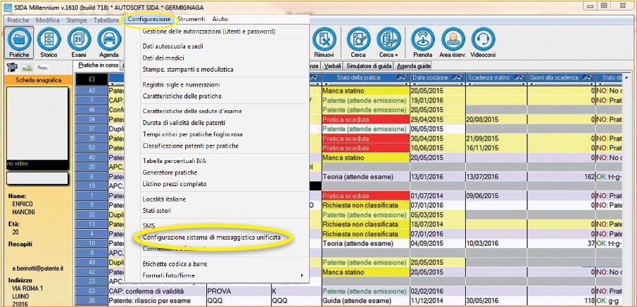 Se abbiamo bisogno di inviare lo stesso messaggio a più allievi, allora selezioniamo i nominativi che ci interessano dalla schermata principale di SIDA Gestione o da qualsiasi punto del software in cui è presente un nominativo (Storico, Esami, Agenda, ecc), clicchiamo sul tasto destro del mouse e scegliamo la voce Invia messaggi e comunicazioni.