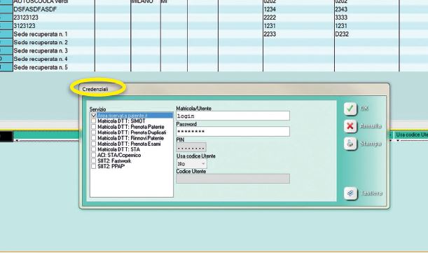 ATTENZIONE: Se il sistema non ci permette di spuntare la sede desiderata, vuol dire che non abbiamo impostato per tale sede la LOGIN e la PASSWORD di accesso all’Area personale patente.it. Andiamo quindi sul bottone Imposta, selezioniamo dalla tab (linguetta) Autoscuola la sede desiderata e poi spostiamoci sul pannello subito sotto Credenziali per.