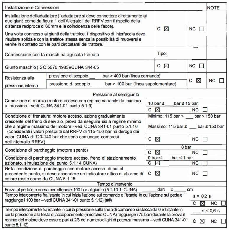 È ammesso l'abbinamento, per i soli veicoli muniti di impianto di frenatura pneumatica. con trattrici agricole, circolanti in Italia ed omologate secondo la previgente normativa (direttiva 741150/CEE o 2003137/CE e successive modificazioni) ovvero secondo le norme nazionali (Codice della Strada), nei limiti di massa rimorchiabile e rapporto di traino come indicato nella carta di circolazione o nell'Allegato tecnico (parte integrante della carta di circolazione) del veicolo trattore, solo se la trattrice è equipaggiata con gancio di traino omologato CE/UE (già previsto all'atto dell'omologazione comunitaria della trattrice) ovvero omologato secondo le norme nazionali con marcatura OGM, del tipo compatibile con il dispositivo di attacco del veicolo rimorchiato secondo quanto indicato nella tabella 2 dell'Appendice 1 dell'Allegato XXXIV del Regolamento UE 2015!208-2016/1788, tabella allegata alla presente (allegato n.8), e specificato nella carta di circolazione del veicolo rimorchiato. È obbligo dell'utilizzatore la verifica del corretto accoppiamento dei dispositivi di attacco meccanico secondo le indicazioni fomite dai costruttori dei veicoli e dei dispositivi, nonché la verifica di compatibilità dei giunti di accoppiamento del tipo CUNA e/o ISO delle condotte pneumatiche/idrauliche"