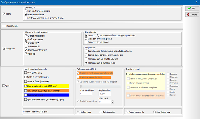 abbiamo già selezionato i quiz maggiormente significativi, che sono proiettati da default in aula (flag giallo). Dal momento che il listato KB è recentissimo, non è ancora possibile rilevare le statistiche dei quiz più sbagliati dai candidati. Tra qualche mese, quando i vostri candidati avranno terminato le esercitazioni, sarà possibile avere in SIDA questo tipo di statistica. Si potrà quindi decidere di proiettare in aula i quiz più difficili per gli allievi (della vostra autoscuola, o su base nazionale), facendo segno di spunta su "Quiz difficili Scuola e/o SIDA", nel pannello di configurazione della lezione (flag arancione).