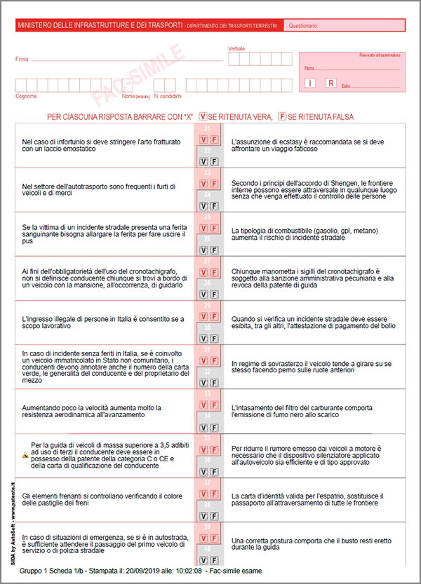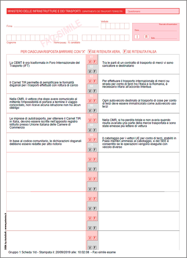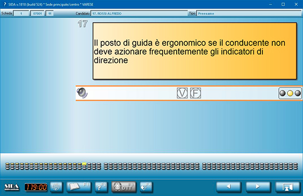 Dopo la consueta maschera di selezione, SIDA presenterà (ad esempio nel caso di una scheda fac-simile esame), una scheda CQC con 70 quesiti, anzichè con 120.