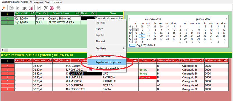 Con questa funzionalità è possibile sincronizzare gli esiti di una sessione d'esame automaticamente con il portale, appena questi saranno disponibili. Per attivare questa funzione è necessario selezionare una seduta d'esame, e selezionare la relativa voce dal menu contestuale. Verranno aggiornati gli esiti dei candidati presenti nei verbali della seduta d'esame selezionata.