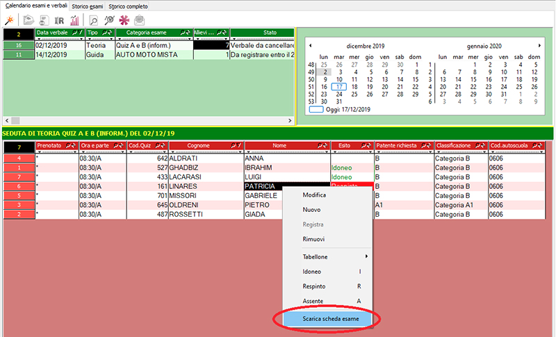 Con questa funzionalità è possibile scaricare e visualizzare la scheda d'esame quiz del candidato. Per attivare questa funzione è necessario selezionare il candidato e selezionare la relativa voce dal menu contestuale. Verrà visualizzata la scheda del candidato in formato PDF.