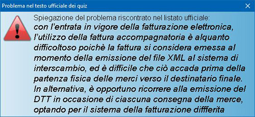 A seguito di questa modifica normativa, il quiz 12136 F06 (Per trasportare merci di tutti i generi non è più usata la fattura accompagnatoria) diventa vero. Pertanto è stato segnalato con la seguente dicitura: