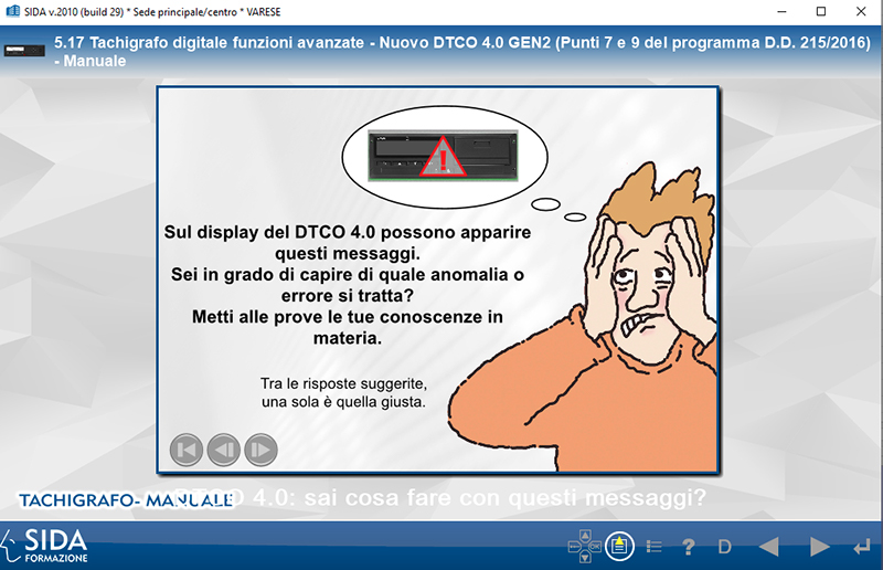 Per accedere al nuovo simulatore DTCO 4.0, cliccare sull'apposita icona in basso sullo schermo, oppure, dal menu, selezionare il capitolo 10. Simulatori e cliccare sull'animazione 14153 (Tachigrafo digitale DTCO 4.0).