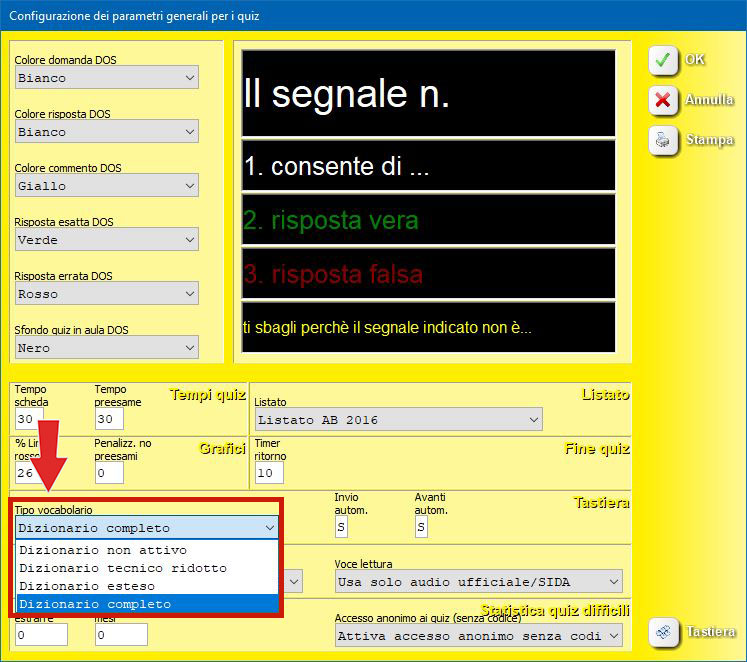 La scelta della tipologia di vocabolario da attivare e della relativa estensione viene effettuata dal modulo quiz, cliccando sul bottone delle impostazioni, scegliendo la funzione "parametri generali quiz".