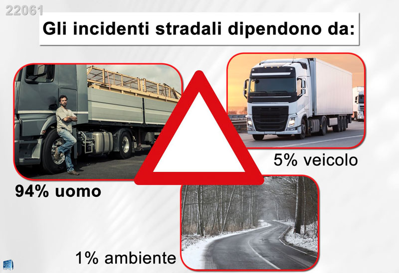 L'ora dedicata alla sicurezza stradale è stata integrata con contenuti multimediali, relativi ai risultati di una indagine condotta da Volvo Trucks per individuare quali fossero le categorie di incidenti che coinvolgono i mezzi pesanti di trasporto merci. Sulla base di questa ricerca abbiamo elaborato del materiale multimediale che illustra le principali cause di incidente che coinvolgono i mezzi pesanti, anche rispetto alle altre categorie di veicoli e degli utenti deboli della strada.