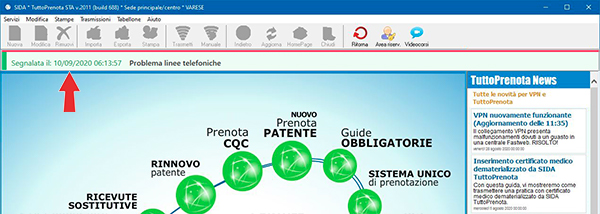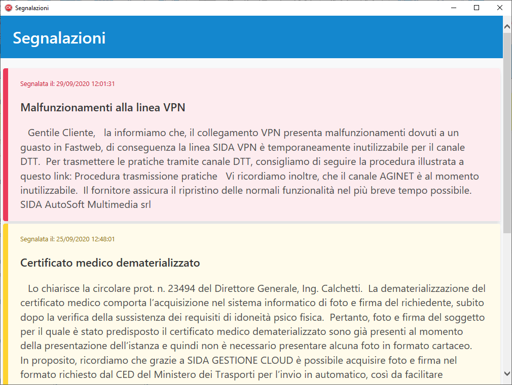 In SIDA TuttoPrenota, nella schermata principale del software, nella schermata principale del software, è presente un elenco di segnalazioni costantemente aggiornato, che segnala in tempo reale la presenza e/o la soluzione di malfunzionamenti sul Cloud, sul portale o altri servizi web.