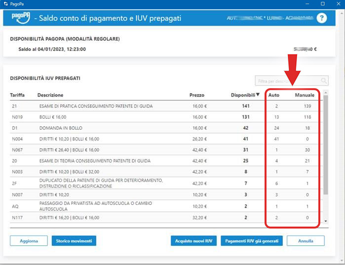 - Distinzione tra abbinamento automatico e manuale delle tariffe disponibili: nella sezione "Conto e IUV", nell'elenco degli IUV disponibili sono state aggiunte le colonne "Auto" e "Manuale". La colonna "Auto" mostra gli IUV con abbinamento automatico mentre la colonna "Manuale" mostra gli IUV con abbinamento manuale ovvero quelli usati per uno specifico candidato.