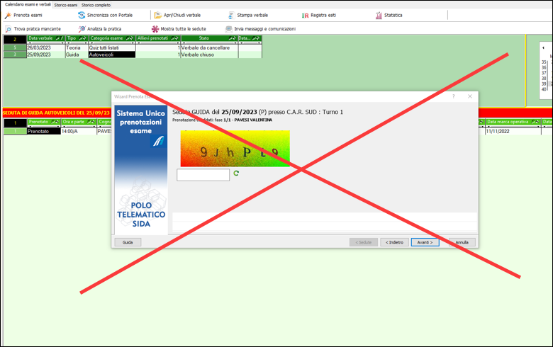 • Prenotazione esami - Captcha: quando si clicca su "Esami --> Prenota esami" e si selezionano dei candidati da prenotare, al termine dell'operazione non comparirà più la finestra con l'inserimento del codice Captcha, il quale verrà inserito direttamente dal gestionale rendendo l'operazione più semplice e veloce.
