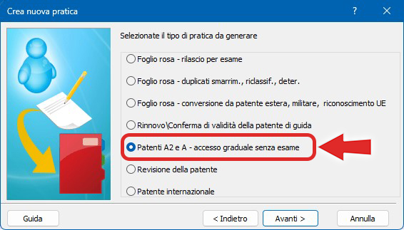 Al momento è possibile creare la pratica "Patenti A2 e A - accesso graduale senza esame" e gestire la prima e seconda fase dal gestionale; il resto della procedura va effettuato dal Portale.