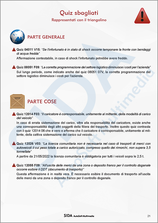 Inoltre, contiene la lista dei quiz con errori ministeriali (triangolino rosso) aggiornati al listato 2022, In aula e nel modulo quiz, in corrispondenza di questi quiz si trova l'immagine della scimmietta nel commento.