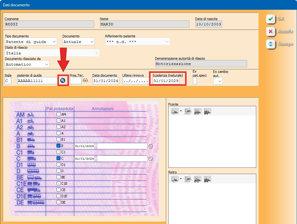 • Corretto bug sul recupero dati patente da Portale (lente di ingrandimento vicino al numero patente di guida); quando si utilizza la funzione di recupero dati patente di un candidato che possiede anche una CQC, la data di scadenza della patente viene aggiornata correttamente così come tutti gli altri dati.