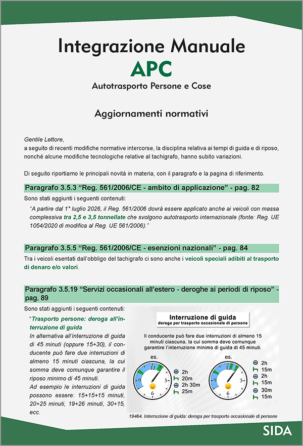 Questo aggiornamento adegua i contenuti dedicati al Tachigrafo e alla normativa sociale sui tempi di guida e di riposo.