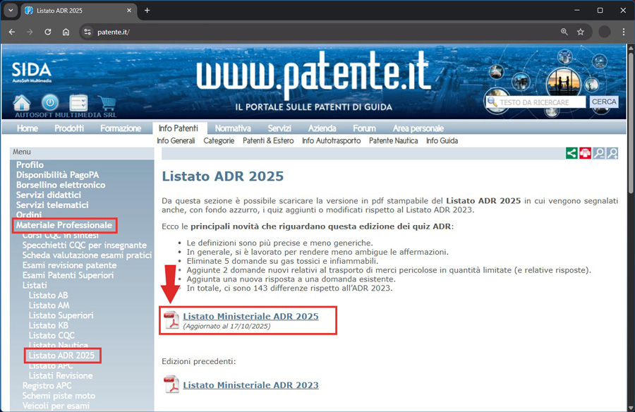 I clienti SIDA che vogliono confrontare nel dettaglio le variazioni del listato ADR 2025 rispetto al listato ADR 2023 possono farlo consultando il materiale apposito presente nell’area personale del sito www.patente.it (Materiale professionale --> Listati --> Listato ADR 2025).
