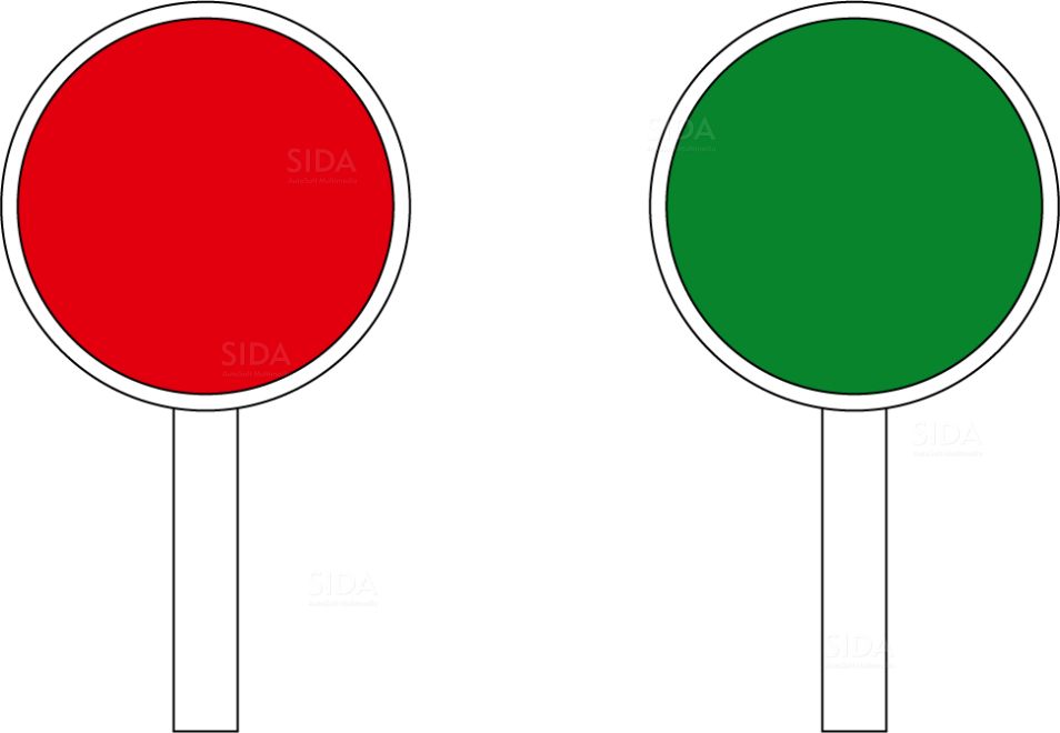 b) TRANSITO ALTERNATO DA MOVIERI. Questo sistema richiede due movieri muniti di apposita paletta, posti a ciascuna estremità della strettoia, i quali presentano al traffico uno la faccia verde, l'altro la faccia rossa della paletta. Il funzionamento di questo sistema è legato al buon coordinamento dei movieri, che può essere stabilito a vista o con apparecchi radio ricetrasmittenti o tramite un terzo moviere intermedio munito anch'esso di paletta. Le palette sono circolari (fig. II.403) del diametro di 30 cm e munite di manico di 20 cm di lunghezza con rivestimento in pellicola rifrangente verde da un lato e rosso dall'altro. I movieri possono anche fare uso di bandiere di colore arancio fluorescente, delle dimensioni non inferiori a 80 x 60 cm, principalmente per indurre gli utenti della strada al rallentamento e ad una maggiore prudenza. Il movimento delle bandiere può essere affidato anche a dispositivi meccanici;