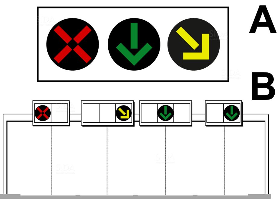 (Art. 41 Cod. Str.) Art. 164. Regolamento di Attuazione Lanterne semaforiche veicolari per corsie reversibili 1. Le lanterne semaforiche veicolari per corsie reversibili hanno lo scopo di consentire la reversibilità del senso di marcia su determinate corsie di una carreggiata suddivisa in tre o più corsie oppure su determinati varchi di stazioni autostradali o, in genere, di barriere di controllo o di pedaggio; tali lanterne devono essere disposte orizzontalmente al di sopra della corsia di marcia cui si riferiscono e presentano due luci: a) luce rossa, a forma di X su fondo nero, posta a sinistra; 2. Nel caso di carreggiate suddivise in tre o più corsie, di cui quelle centrali reversibili, le due luci di cui al comma 1 devono essere integrate da una luce a forma di freccia gialla, su fondo nero, lampeggiante, inclinata verso il basso a destra o sinistra; questa freccia ha lo scopo di indicare al conducente l'obbligo di abbandonare la corsia in cui si trova spostandosi verso la direzione indicata dalla freccia gialla lampeggiante (figg. II.458 e II.459). 3. Almeno una delle due lanterne di cui al comma 1, lettere a) e b), deve essere collocata, coerentemente con il senso di marcia, anche sulle corsie non reversibili. |