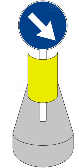 6. I dispositivi a luce riflessa, denominati delineatori speciali di ostacolo (fig. II.472), sono in genere a sezione semicircolare, per consentire una buona individuazione da diverse posizioni di avvicinamento ed hanno uno sviluppo minimo di 40 cm di semicirconferenza per 50 cm di altezza. Devono essere completamente rifrangenti e, se usati in sostituzione delle colonnine luminose o in combinazione con esse, sono di colore giallo.