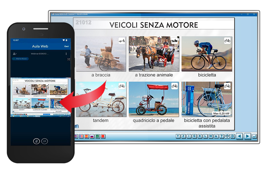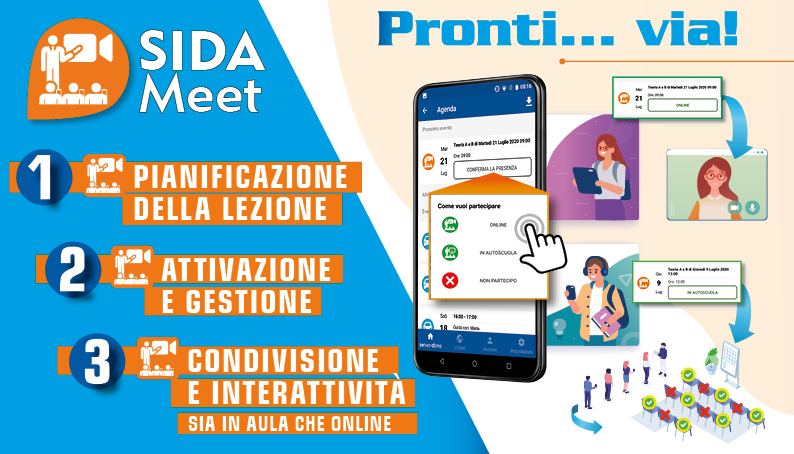 SIDA Meet è una piattaforma per le lezioni online (webinar) che affianca e integra in modo sincrono le lezioni in aula e consente di adottare una didattica blended (= mista) in contemporanea. SIDA Meet è uno strumento semplice e funzionale che integra SIDA AULA. Con solo 3 azioni, l’insegnante PIANIFICA la lezione, INVITA i suoi alunni e CONDIVIDE la sua lezione in aula anche online. L’insegnante invita a partecipare alla lezione SOLO i suoi candidati presenti in SIDA GESTIONE o SIDA GESTIONE Light (gratis), i quali decidono la modalità di partecipazione (in aula o online) direttamente da SIDA Quiz App. Sia i ragazzi presenti in aula che online potranno interagire rispondendo ai quiz proposti dall’insegnante durante la lezione. Con SIDA Meet la gestione dei posti disponibili in aula è automatica, e permette una migliore organizzazione dei posti evitando assembramenti.