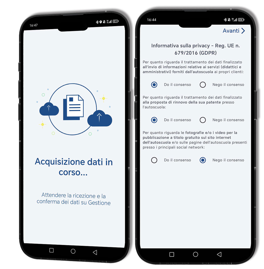 acquisizione foto, firma e consensi privacy dei candidati: con un clic si collega lo smartphone o tablet a SIDA Gestione e con la procedura guidata è possibile acquisire firma, foto e consensi privacy che verranno immediatamente salvati nella pratica del candidato;